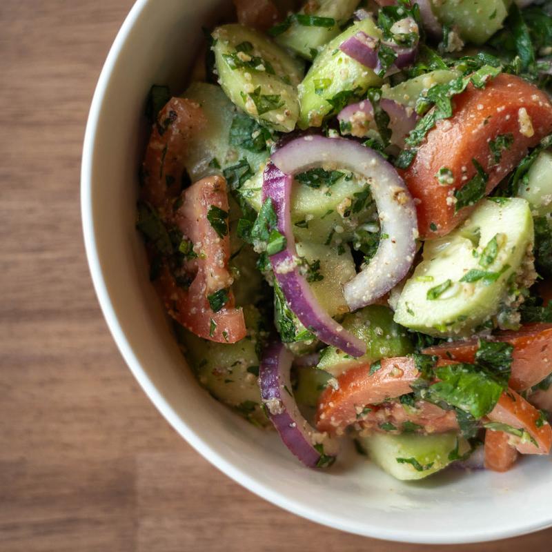 Tomatoes, Cucumbers, Onions, Walnut paste, Parsley, Cilantro, Basil