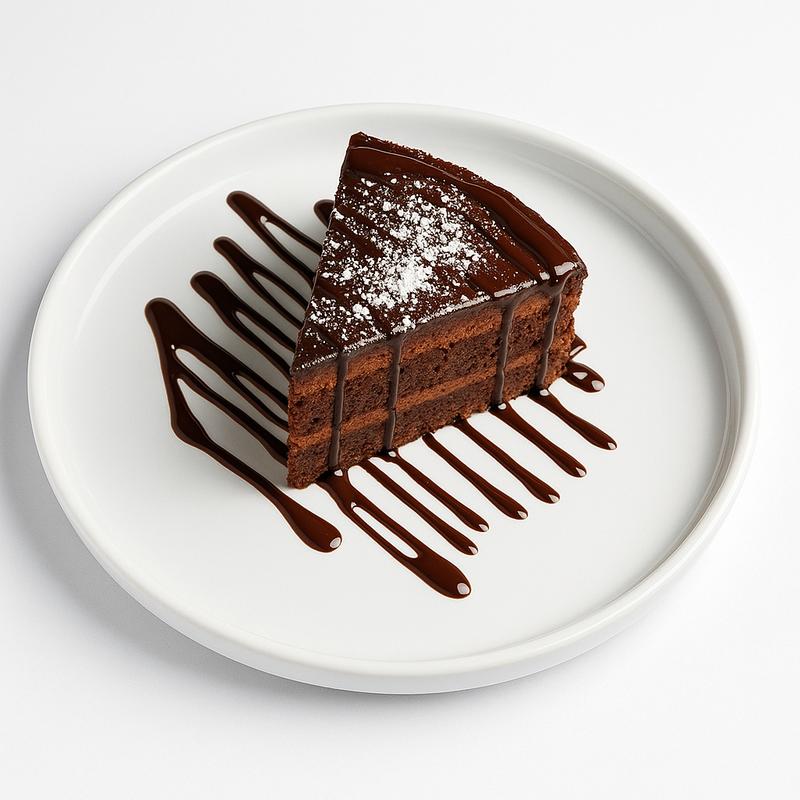 A rich chocolate cake with layers of smooth chocolate cream and covered with a chocolate glaze